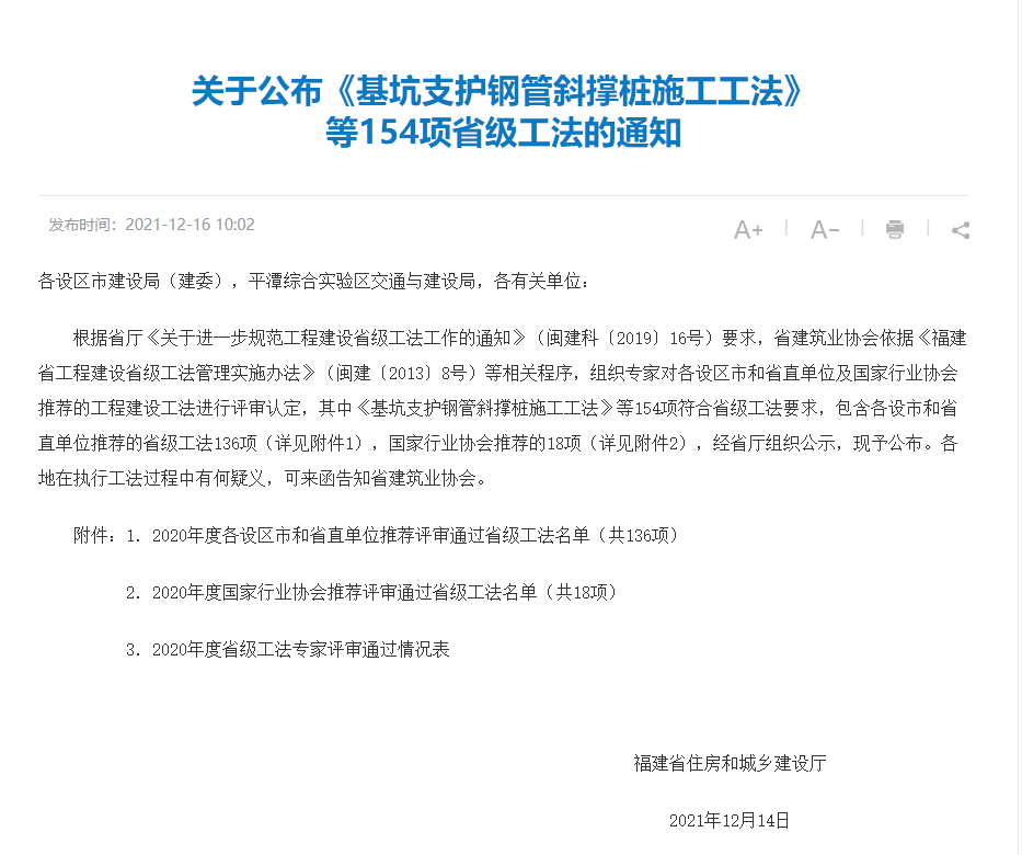 近日,省住建厅发布《<基坑支护钢管斜撑桩施工工法>等154项省级工法的通知》,工程局公司的《承压型变直径钢筋笼扩大头抗浮锚杆施工工法》获评省级工法。