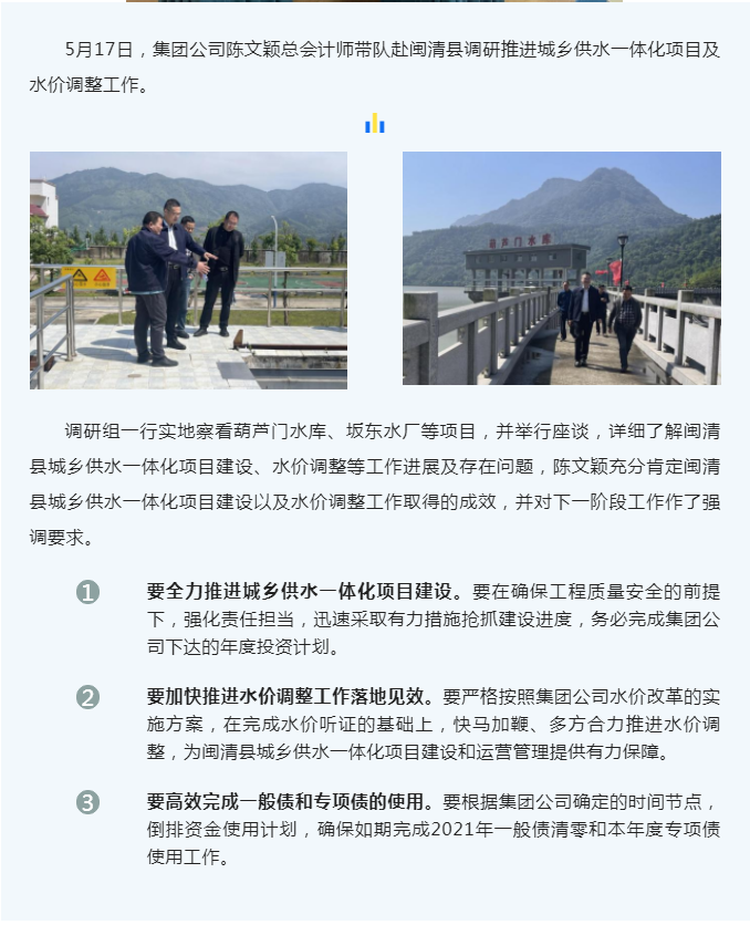 集团公司陈文颖总会计师调研推进闽清县城乡供水一体化项目