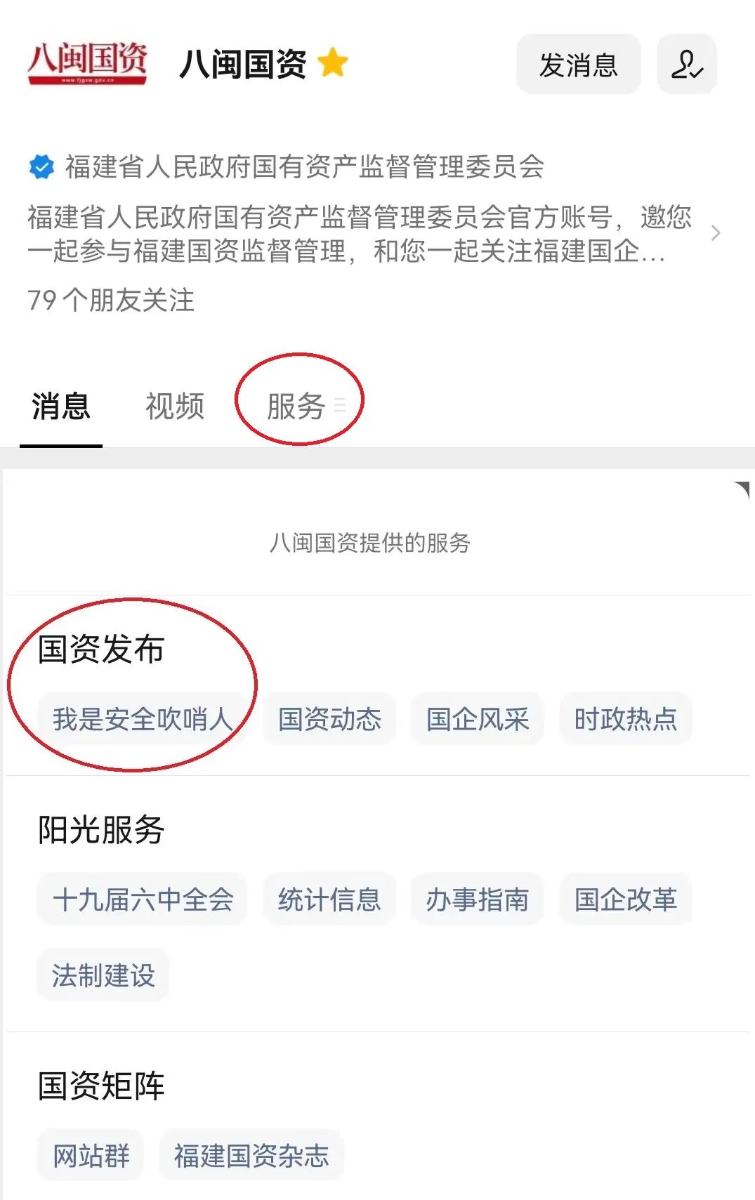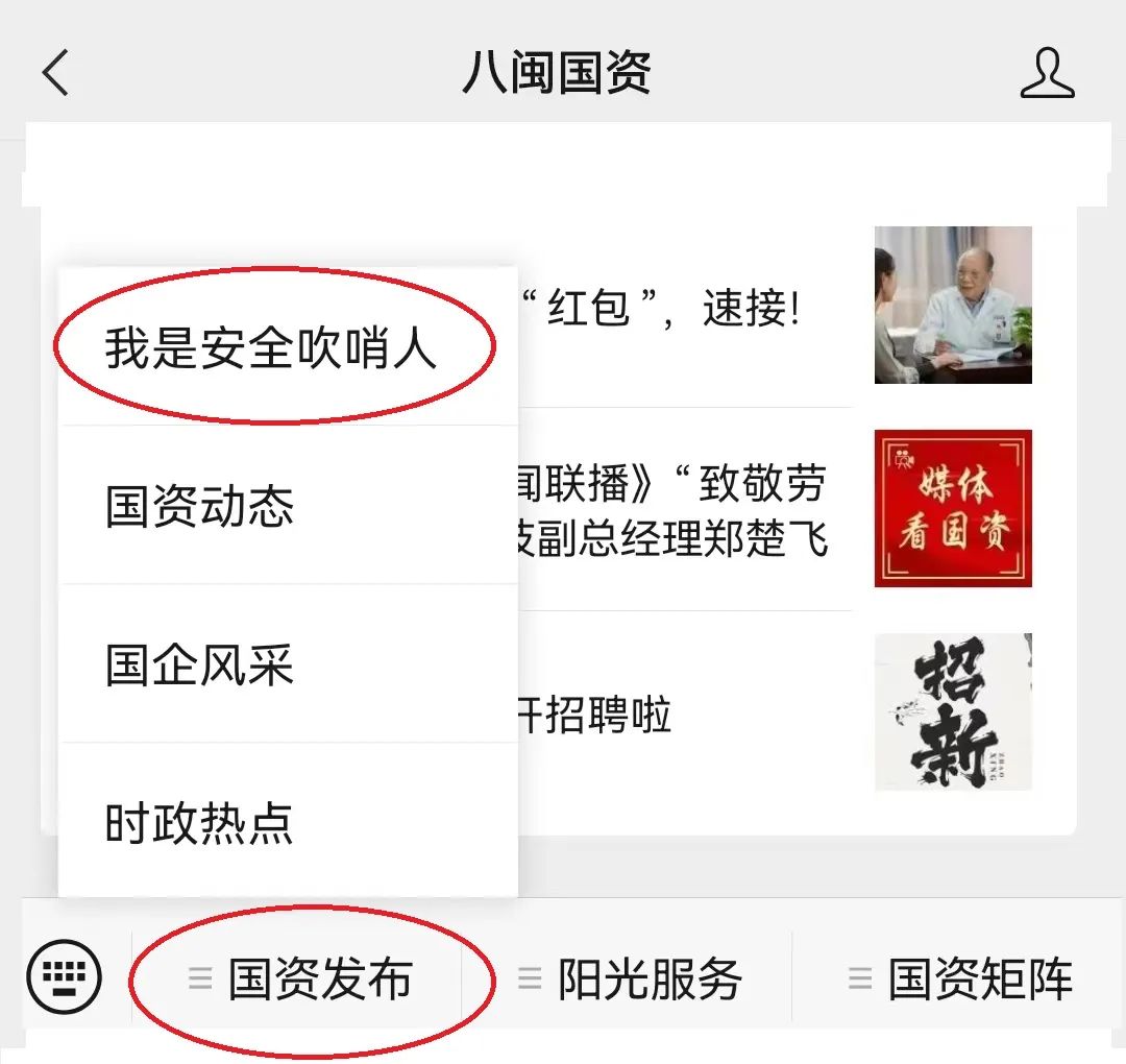 方法二:已关注“八闽国资”公众号的。1.点击“服务”栏目,在弹出的窗口中,点击“国资发布”下方“我是安全吹哨人”模块。