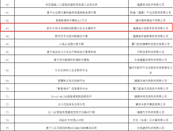 2022年7月24日,在第五届数字中国建设峰会数字福建分论坛上,福建省数字办发布248项数字技术创新应用场景,涵盖人工智能、大数据、5G、区块链、VR/AR等领域,服务延伸新时代人们工作、生活的方方面面。集团公司权属企业水投科技公司的“城乡供水一体化数字水务”、“数字水利水务物联数据与安全关键技术”、“数字水利水务‘一张网’‘一朵云’”三个项目分别入选2022年度福建省数字技术创新应用场景中的典型案例、应用场景优秀技术、产品和解决方案和应用场景建设需求名单。