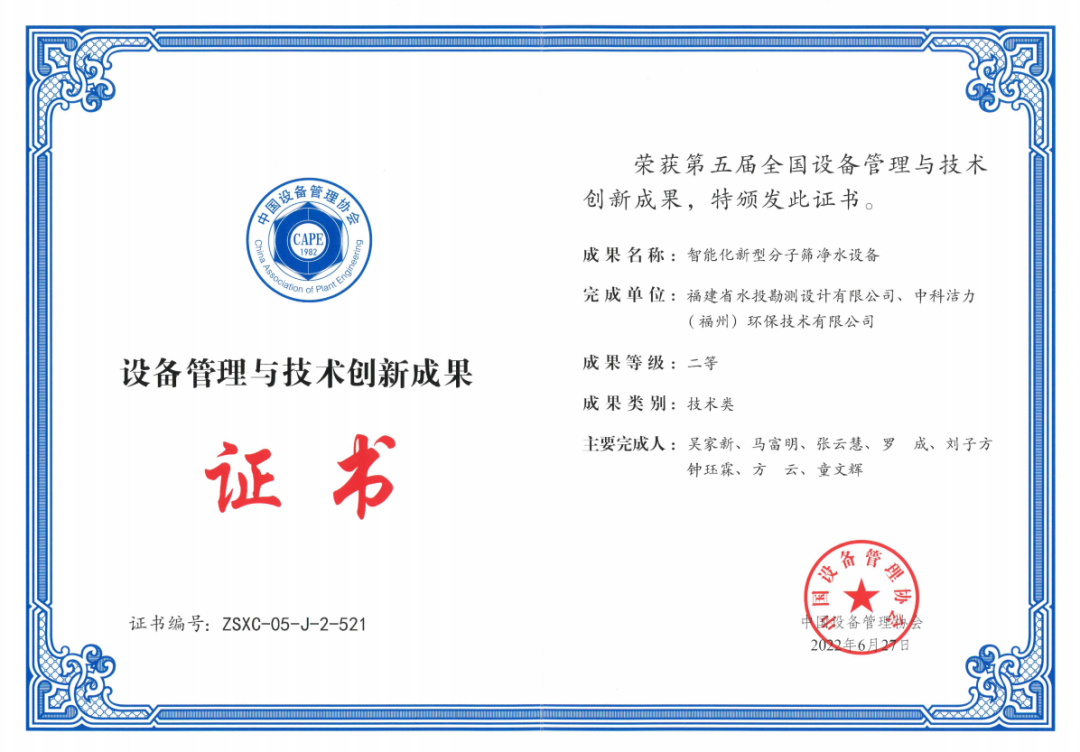 日前,在中国设备管理协会组织开展的“第五届(2020-2021年度)全国设备管理与技术创新成果”评选中,水投设计公司主持研发的“智能化新型分子筛净水设备”项目荣获技术类二等奖。