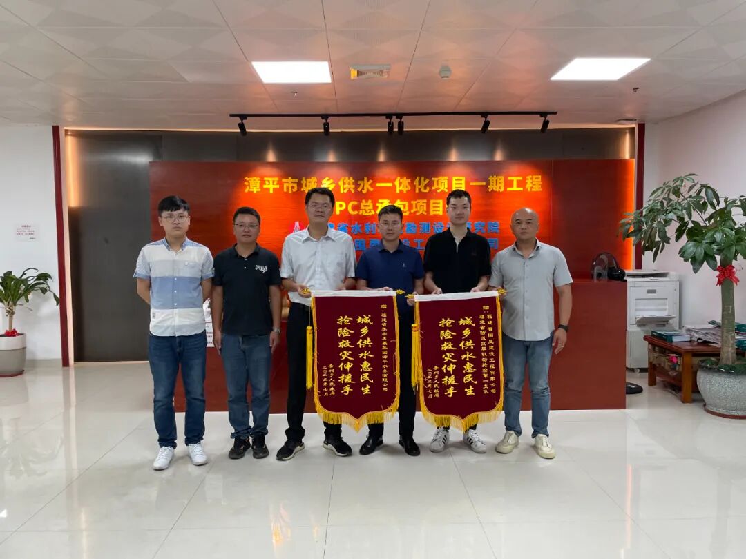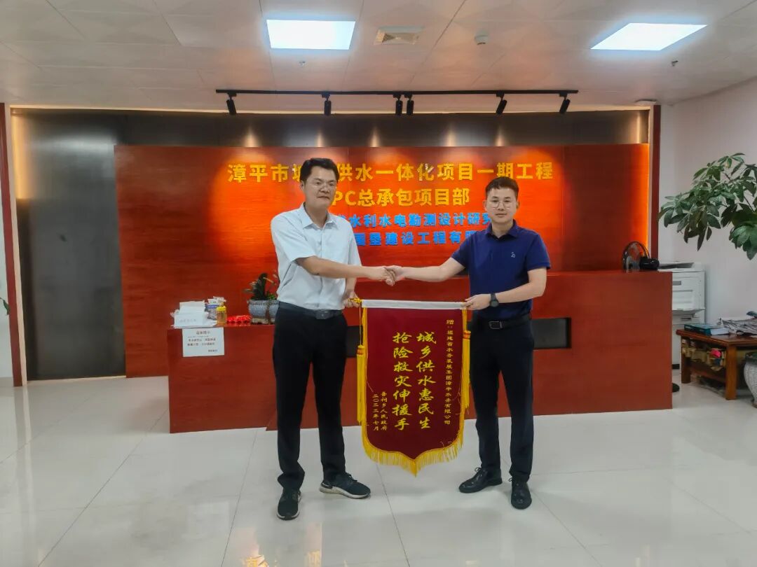 8月25日,龙岩市漳平吾祠乡党委书记吴锦森亲自将两面写着“城乡供水惠民生,抢险救灾伸援手”的锦旗送到漳平市城乡供水一体化一期工程项目部,分别向漳平水务公司和围垦工程公司在防汛抢险救灾工作中的倾情相助表示感谢。