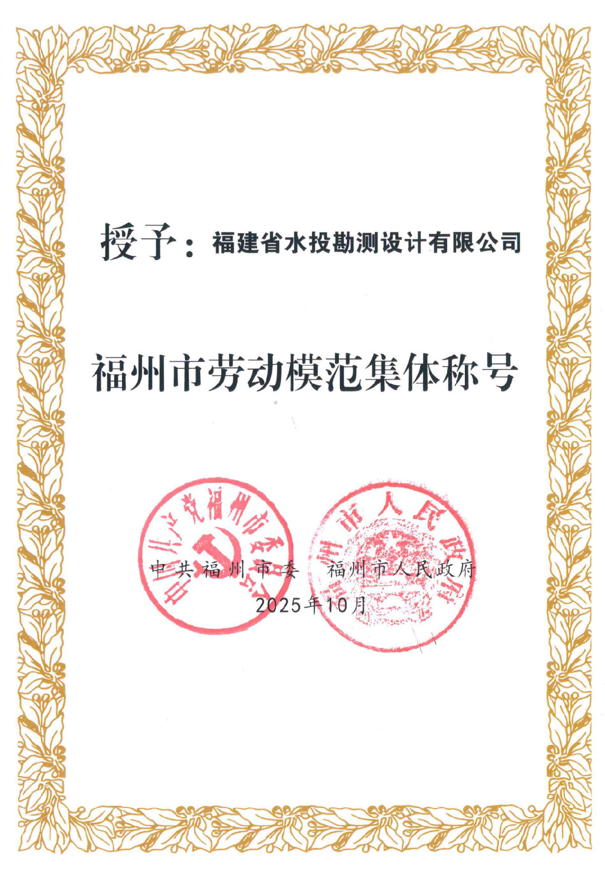10月28日,2025年(第37届)福州市劳动模范集体、劳动模范和先进工作者表彰大会在福州市工人文化宫隆重召开。水投设计公司凭借在党建引领、工会关怀、经营拓展、资质提升和科研创新等方面的突出表现,荣获“福州市劳动模范集体”。