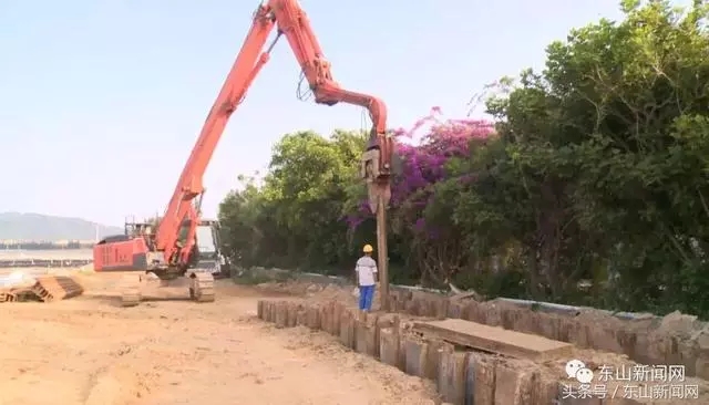 近日,在漳州东山岛外引水第二水源工程建设现场,机械设备正进行大产大桥跨海顶管段接收井的开挖下沉和管道边坡钢板支护安装。