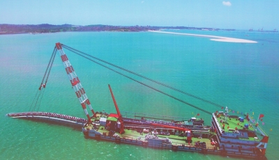 福建向金门供水工程设计流量为3.4万m3/d 远期55万m3,./d。工程由取水泵站、陆地输水管道和跨海输水管道三部分组成。工程取水于晋江龙湖,龙湖面积1.6km2,总库容405万m3。龙湖水量通过晋江南高干渠及晋江供水主通道进行补充,常年水质保持Ⅱ类。取水泵站安装三台水泵。工程输水线路总长27.935km,其中龙湖至晋江沿海大通道(陆地段)管线长11.68km,采用单根DN800mm球墨铸铁管;跨海管道从晋江侧入海点至田埔(海上段)管线长16.052km,采用单根DN800mm HDPE管,跨海管道沿线最大水深24.3m;金门岛上岸点至田埔接水池管线长203m。工程总投资3.88亿元人民币,其中大陆方取水泵站及陆地管道部分工程投资1.29亿元人民币。