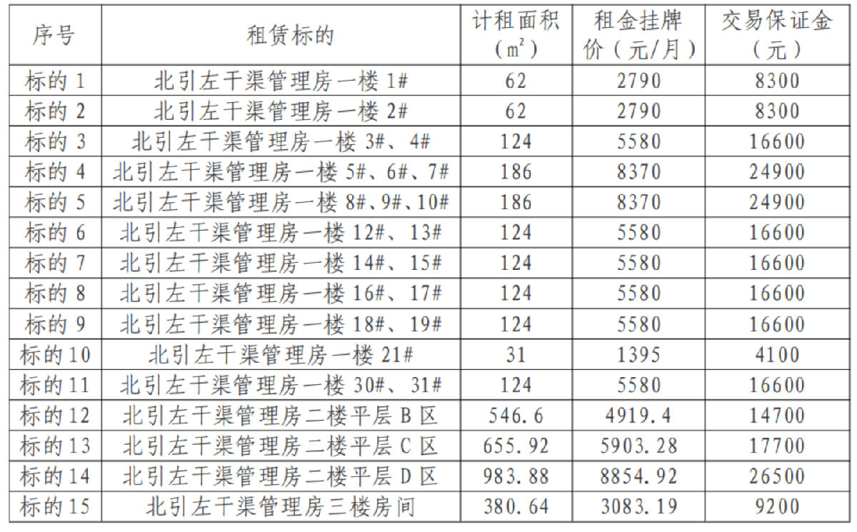 注:以上租赁标的分别招租。同一竞租人在符合竞租条件的前提下可报名竞租单个标的或多个标的,报名竞租多个标的的,需针对每一个标的交纳足额交易保证金。