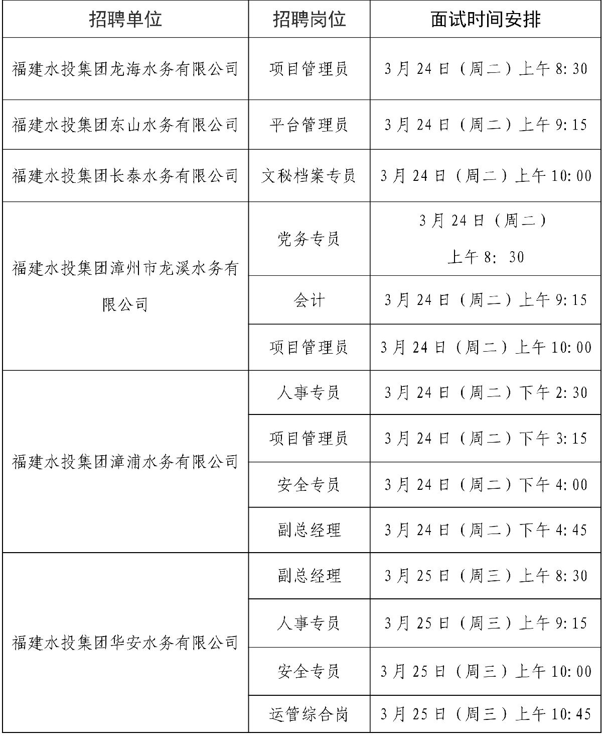 福建省水利投资开发集团有限公司权属三级企业:福建水投集团华安水务有限公司、福建水投集团龙海水务有限公司、福建水投集团漳浦水务有限公司、福建水投集团东山水务有限公司、福建水投集团长泰水务有限公司、福建水投集团漳州市龙溪水务有限公司等6家企业职能管理岗位招聘采用先笔试后面试程序进行。经笔试,现将部分岗位进入面试环节人员及有关事项通告如下: