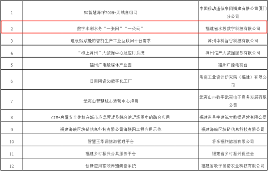 2022年7月24日,在第五届数字中国建设峰会数字福建分论坛上,福建省数字办发布248项数字技术创新应用场景,涵盖人工智能、大数据、5G、区块链、VR/AR等领域,服务延伸新时代人们工作、生活的方方面面。集团公司权属企业水投科技公司的“城乡供水一体化数字水务”、“数字水利水务物联数据与安全关键技术”、“数字水利水务‘一张网’‘一朵云’”三个项目分别入选2022年度福建省数字技术创新应用场景中的典型案例、应用场景优秀技术、产品和解决方案和应用场景建设需求名单。