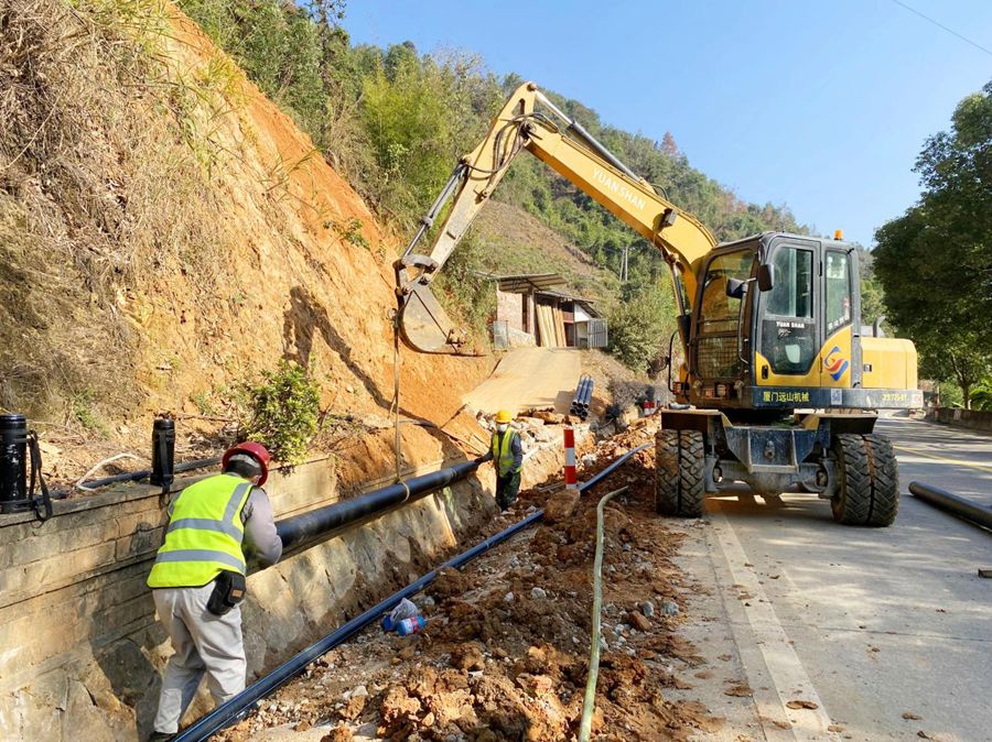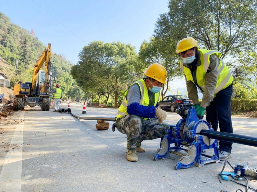 12月22日,在三明市尤溪县梅仙镇源湖村,工人正加紧敷设管道,全力推进城乡供水一体化项目。