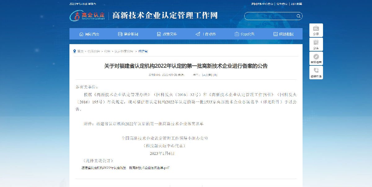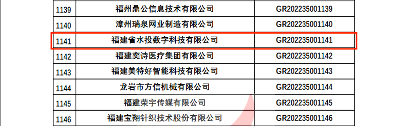 2023年1月6日,全国高新技术企业认定管理工作领导小组办公室发布《福建省认定机构2022年认定的第一批高新技术企业备案名单》,集团所属水投科技公司成功入选。本次入选是对水投科技公司科研创新实力的认可,公司将继续走自主创新、持续创新的发展道路,以水行业数字科技创新为目标,为水利信息化建设提供全方位、高质量的保障,力争成为国内领先的创新型高科技企业。