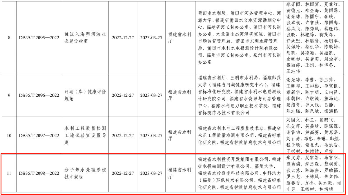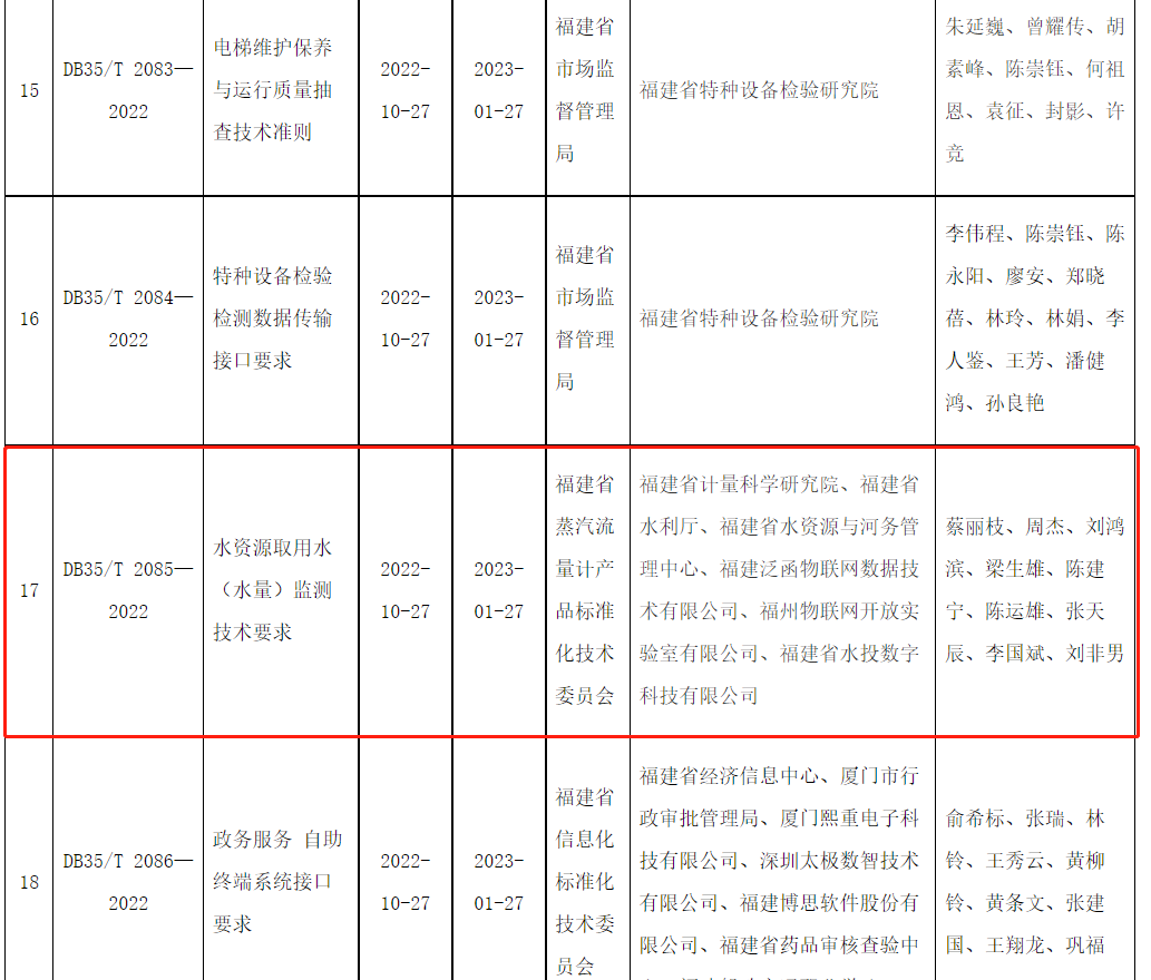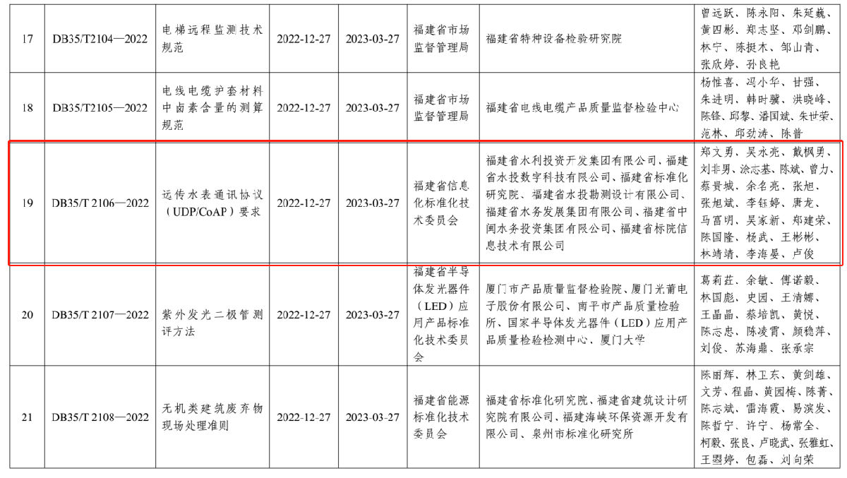近日,由集团系统牵头或主要参与编制的3项福建省地方标准获批发布。其中,由集团公司牵头、水投科技公司主导编制的《远传水表通讯协议(UDP/CoAP)要求》(DB35/T 2106-2022),水投设计公司主导编制的《分子筛水处理系统技术规程》(DB35/T 2098-2022)实施日期为2023年3月37日;水投科技公司参与编制的《水资源取用水(水量)监测技术要求》(DB35/T 2085-2022)实施日期为2023年1月27日。