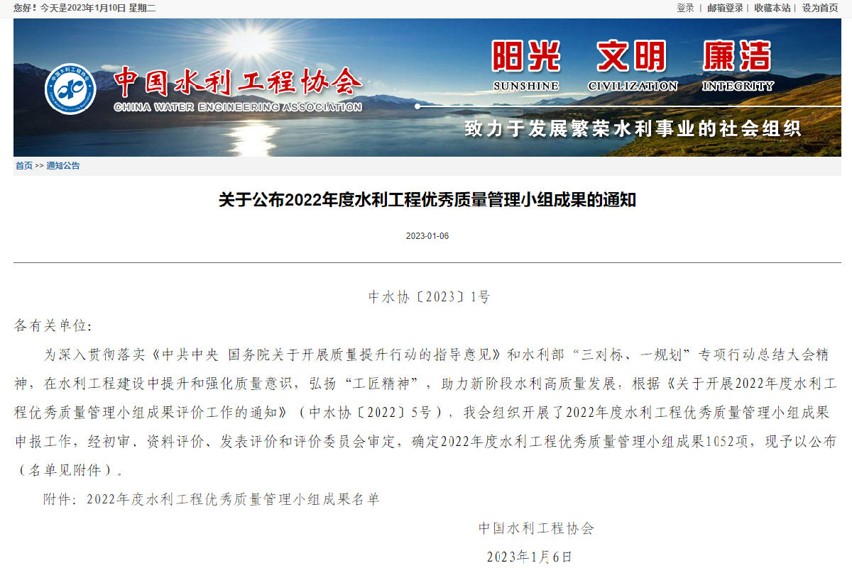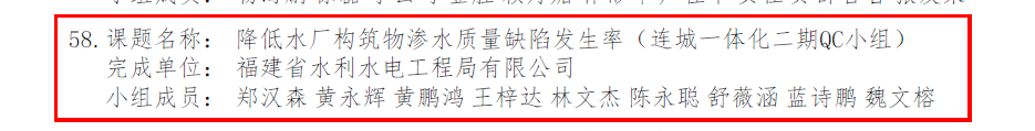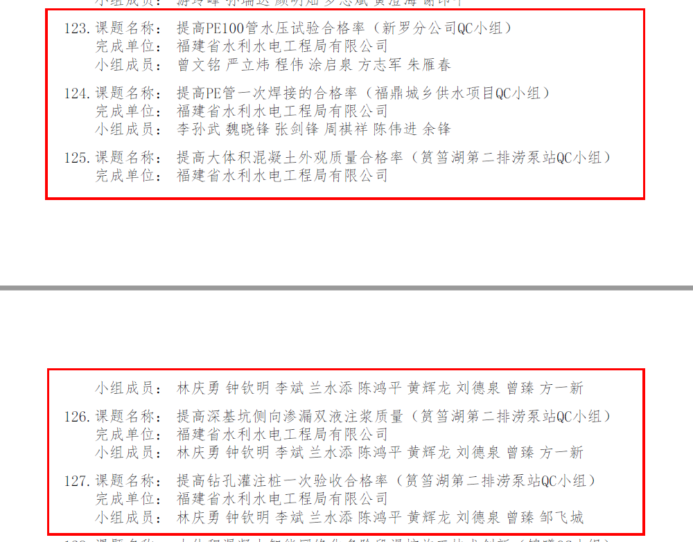 日前,工程局公司选送的6项QC管理小组成果全部通过中国水利工程协会评审。其中,《提高PE100管水压试验合格率》《提高PE管一次焊接的合格率》《提高大体积混凝土外观质量合格率》《提高深基坑侧向渗漏双液注浆质量》《提高钻孔灌注桩一次验收合格率》获得Ⅱ类成果;《降低水厂构筑物渗水质量缺陷发生率》获得Ⅲ类成果。