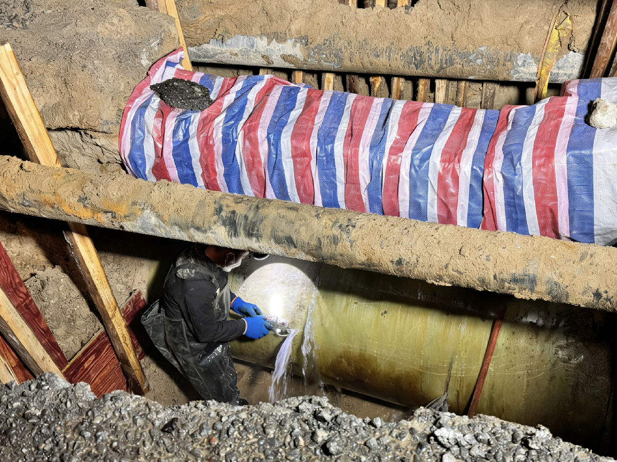 下午时分,漏点终于现身。在三米深的坑底,一根DN1000玻璃钢管的侧方和下方,出现了两处破损。