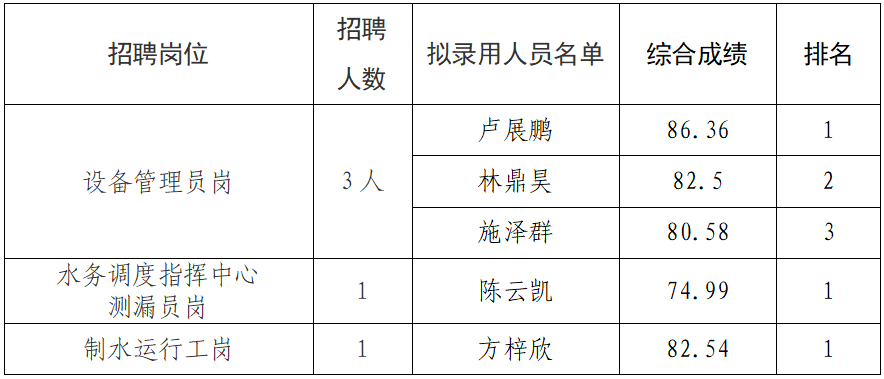 根据福建水投集团平潭水务有限公司招聘公告,经过报名、资格审查、笔试、面试等公开招聘程序,现将拟录用人员进行公示。公示时间从2026年4月2日开始,公示期为七个自然日。在此期间内,如有意见可通过来电、来信、来访的形式反映情况。
