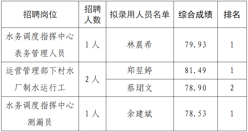 根据福建水投集团将乐水务有限公司招聘公告,经过报名、资格审查、笔试、面试等公开招聘程序,现将拟录用人员进行公示。公示时间从2026年4月28日开始,公示期为七个自然日。在此期间内,如有意见可通过来电、来信、来访的形式反映情况。